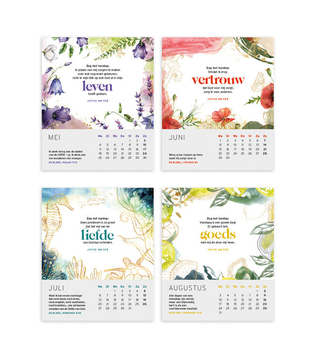 Deze prachtig vormgegeven kalender geeft je elke maand een inspirerende gedachte om hardop over je leven uit te spreken — soms bemoedigend, soms uitdagend.